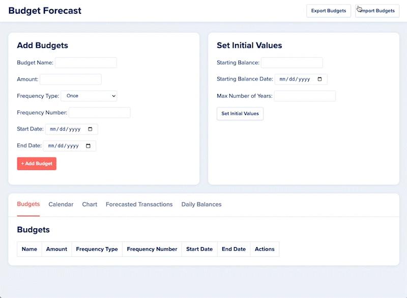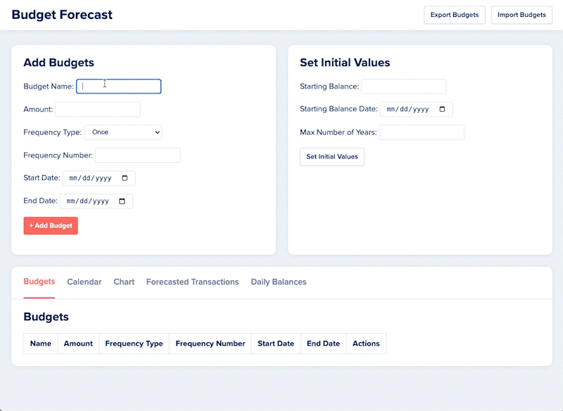 I also wanted to establish a starting point for the forecast, so I implemented a form to input a starting balance and starting date.