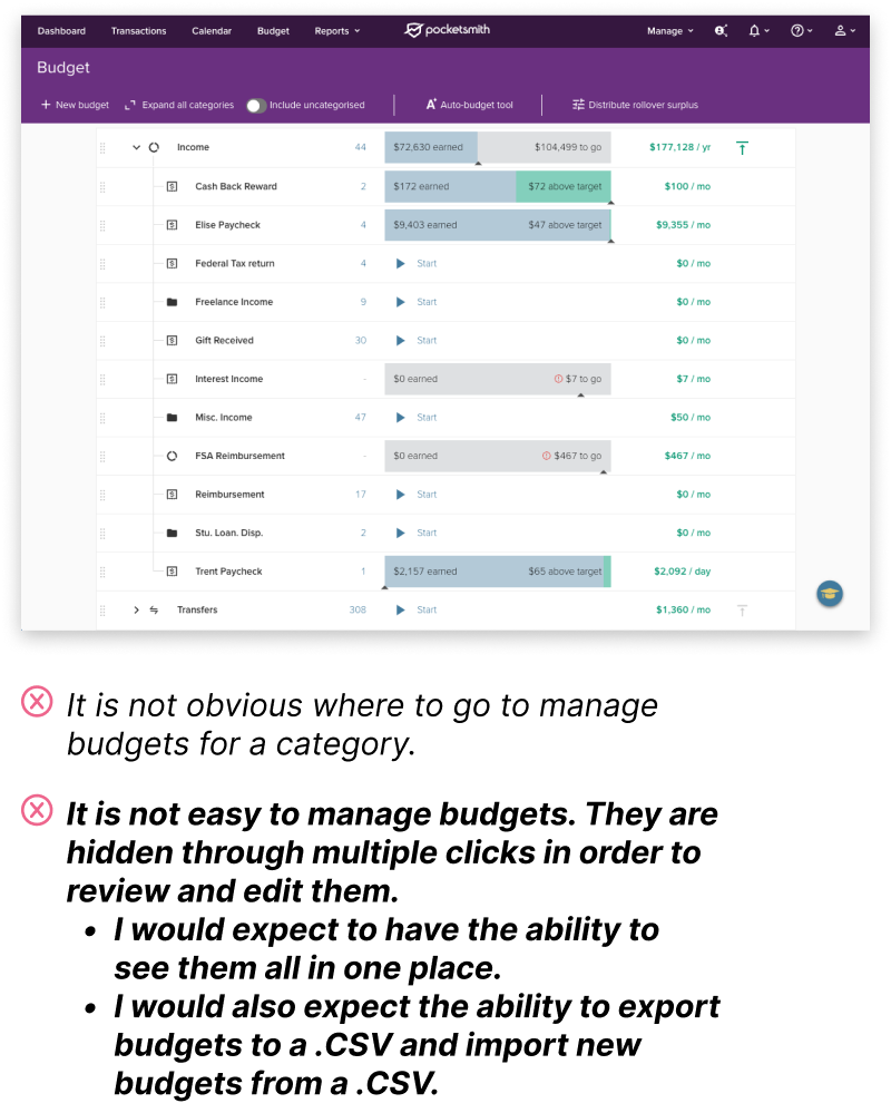 The image below notes one of the key problem areas I experienced while working with Pocketsmith.